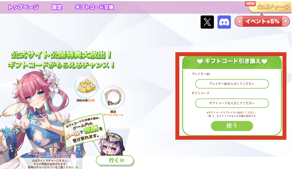 ④プレイヤーIDとギフトコードを入力