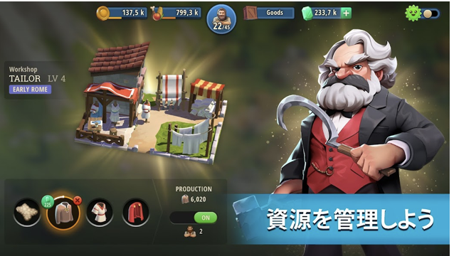 ヒーローズオブヒストリーは石器時代から未来まで時を越えて自分だけの街を作れる文明開拓シミュレーションゲームです。