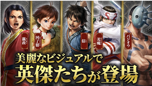キングダム覇道では信、王騎、嬴政、羌瘣、騰、楊端和などキングダムの人気武将たちが続々登場