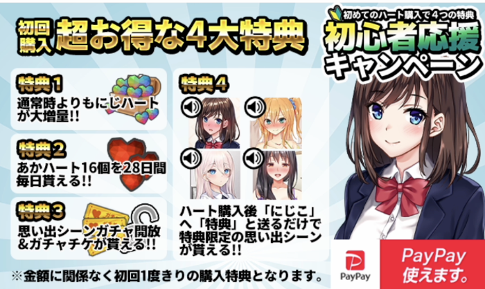 また、にじげんカノジョ(二次元彼女)はゲーム開始時に無料コイン「あかハート」を73個もらえます。