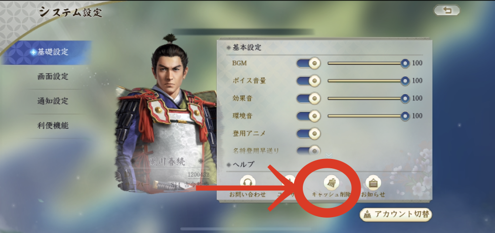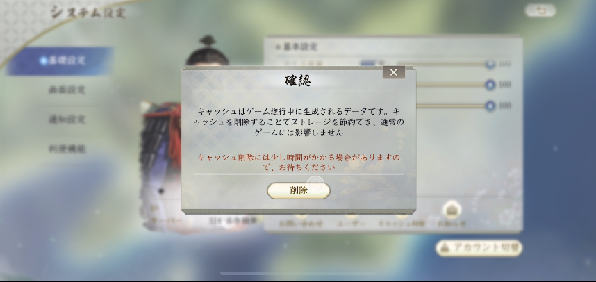 「信長の野望 真戦」には増えすぎた空き容量を減らす機能がついています。それが「キャッシュ削除」機能です。
