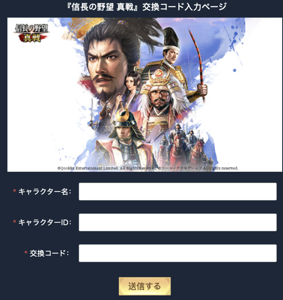 「信長の野望 真戦」の交換コード(ギフトコード)の入力はゲーム外のサイトから行います。