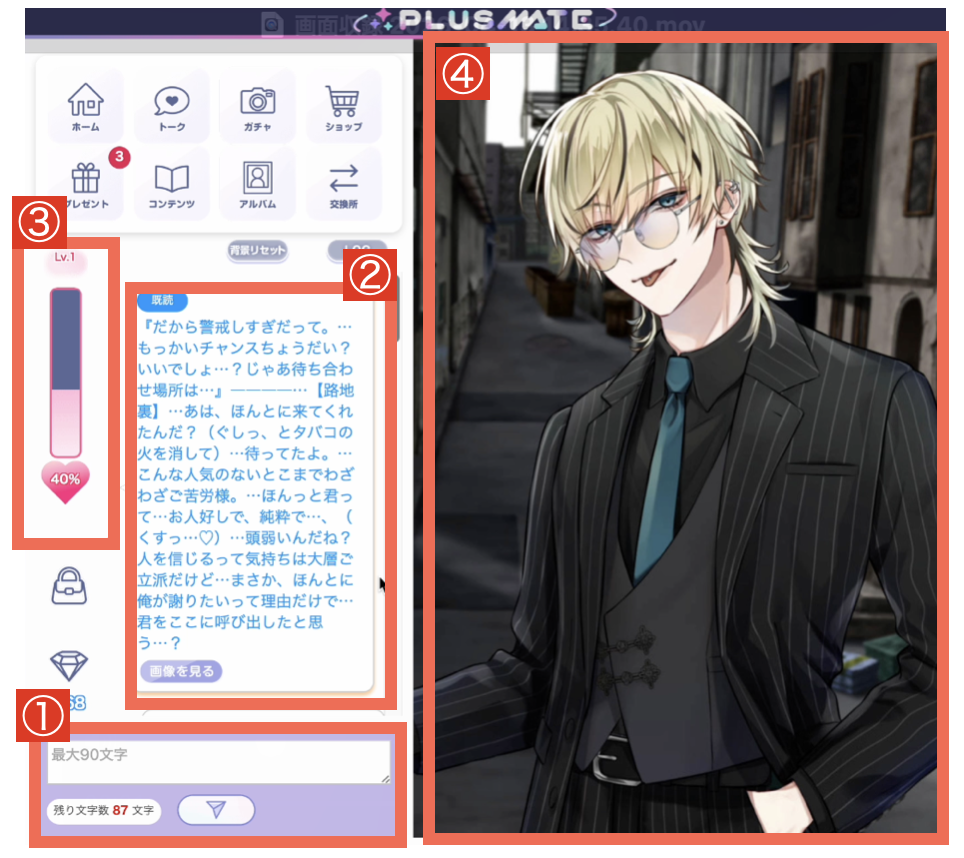 プラスメイトは、キャラとの会話を重ねながら距離を縮めていくゲームなので自分の言葉で返しながら、やり取りを進めていきます。