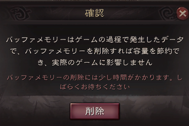 「三国志真戦」は不要なデータを削除して、空き容量を増やすことができる「キャッシュ削除機能」が用意されています。