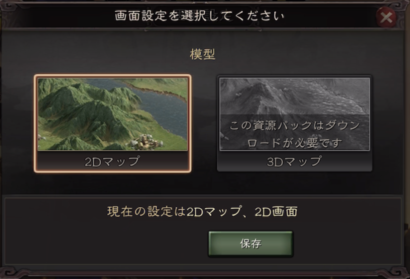 ゲームを初回起動した時点での初期設定は「2Dマップ」です。