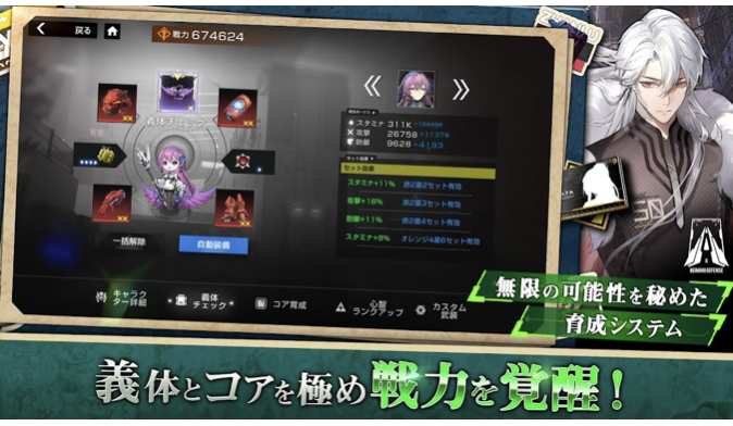 強化のメインになる「コア」を集めて合成し、キャラクター「義体」にセットすることでキャラクターの潜在能力を解放していきます。